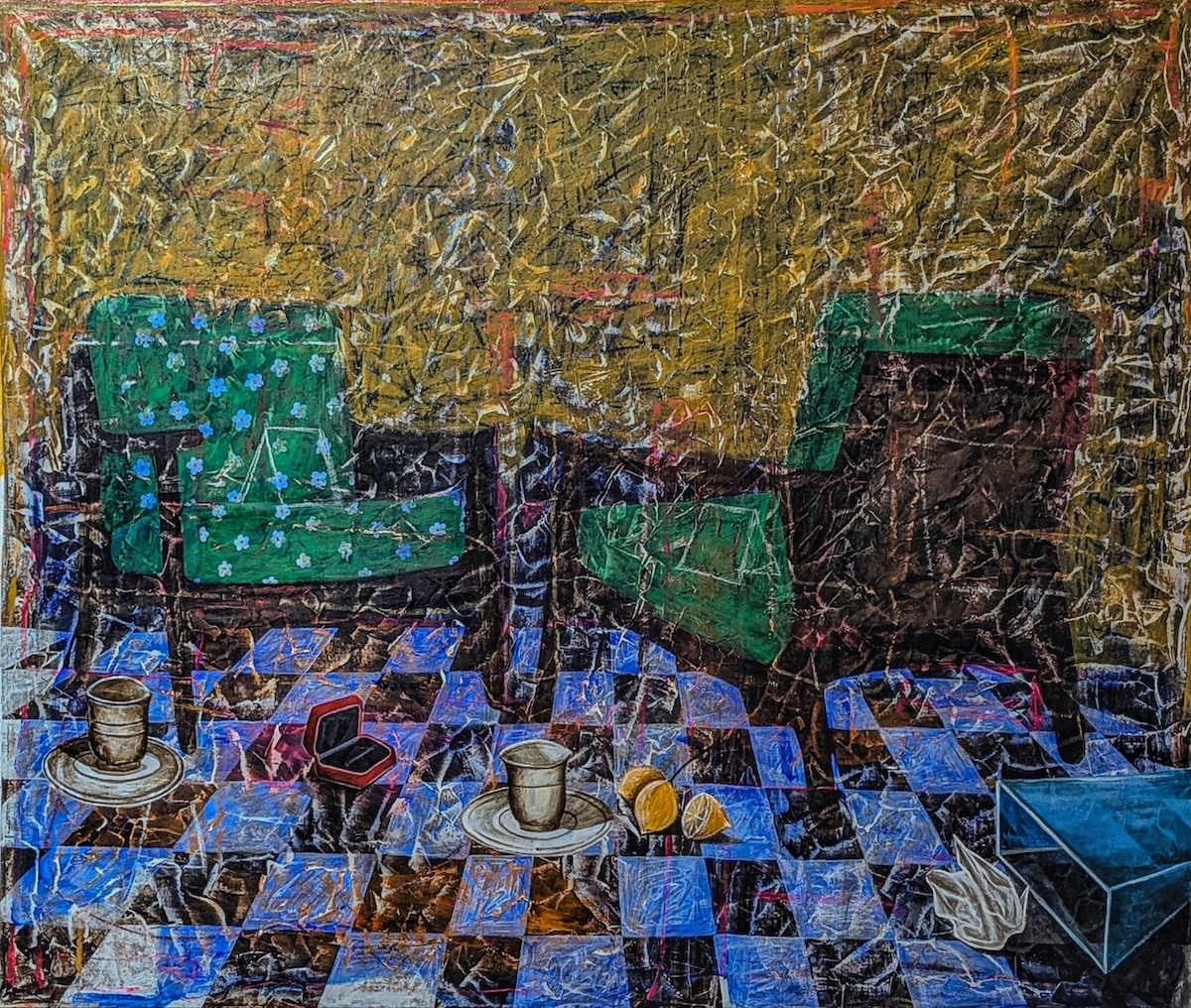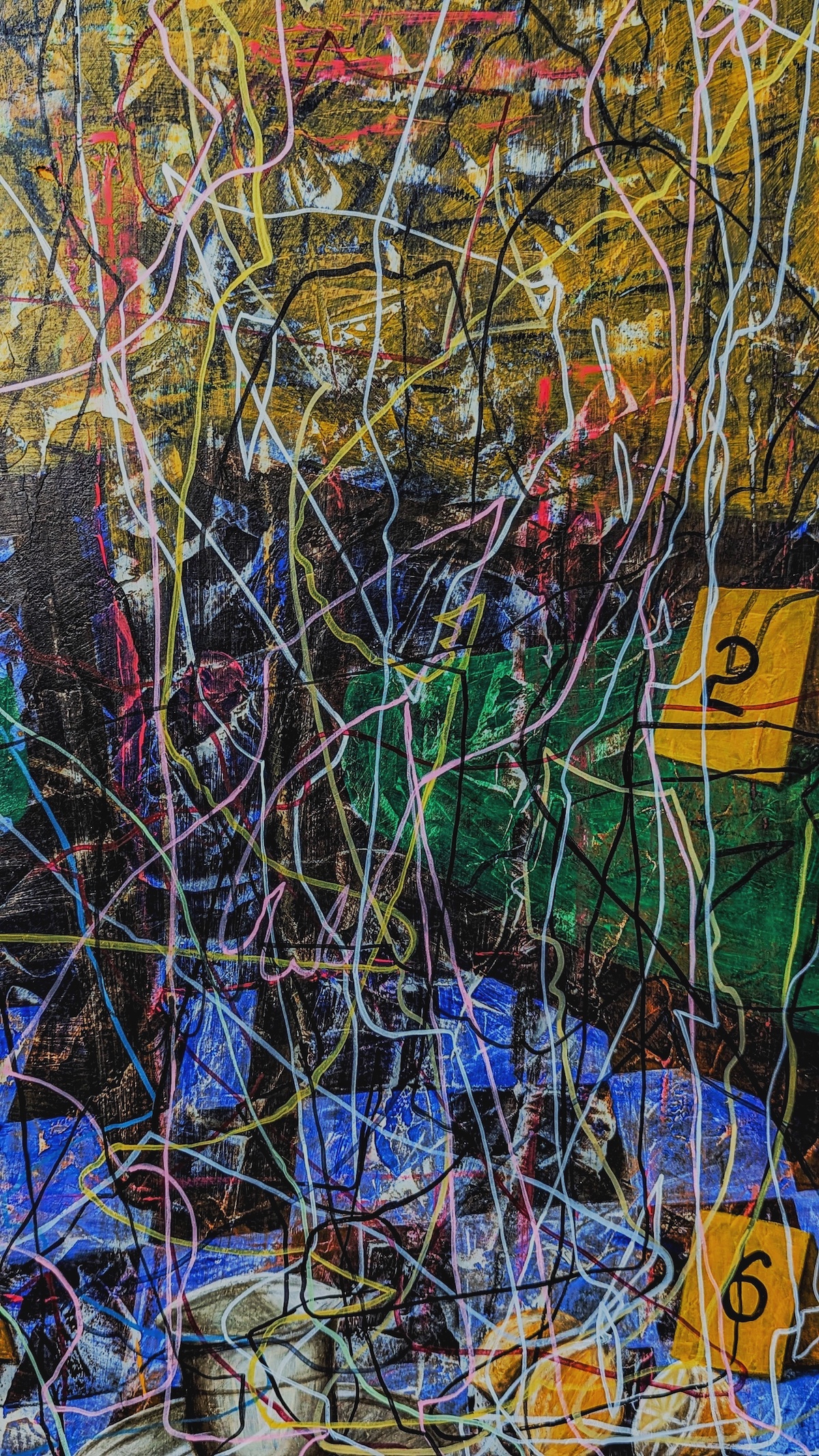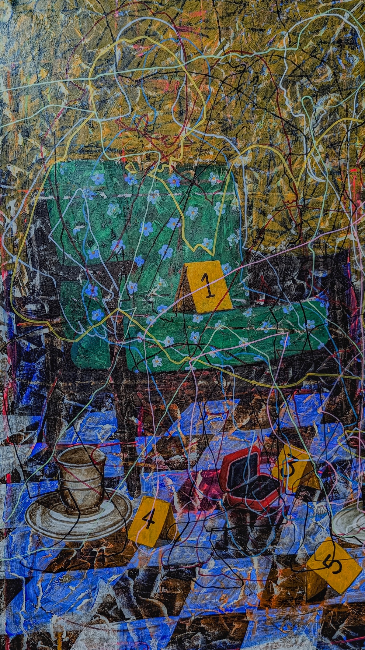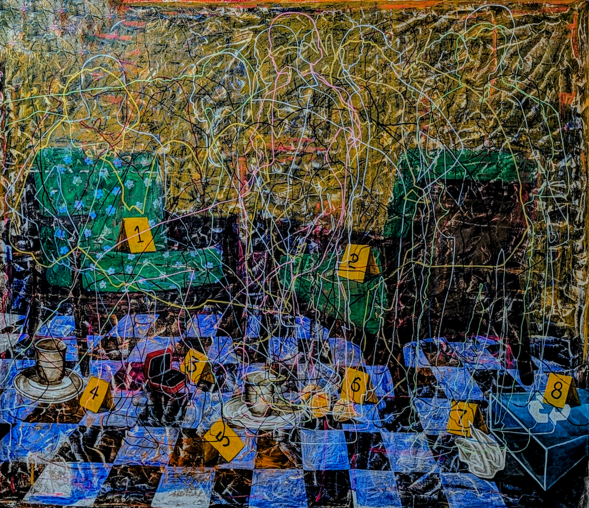 Chairs, cups, a red ring box, a trashed piece of paper, and a recycling bin overlaid with a vibrant, almost chaotic network of abstract lines: the hint of a human figure in a dense, energetic field.
