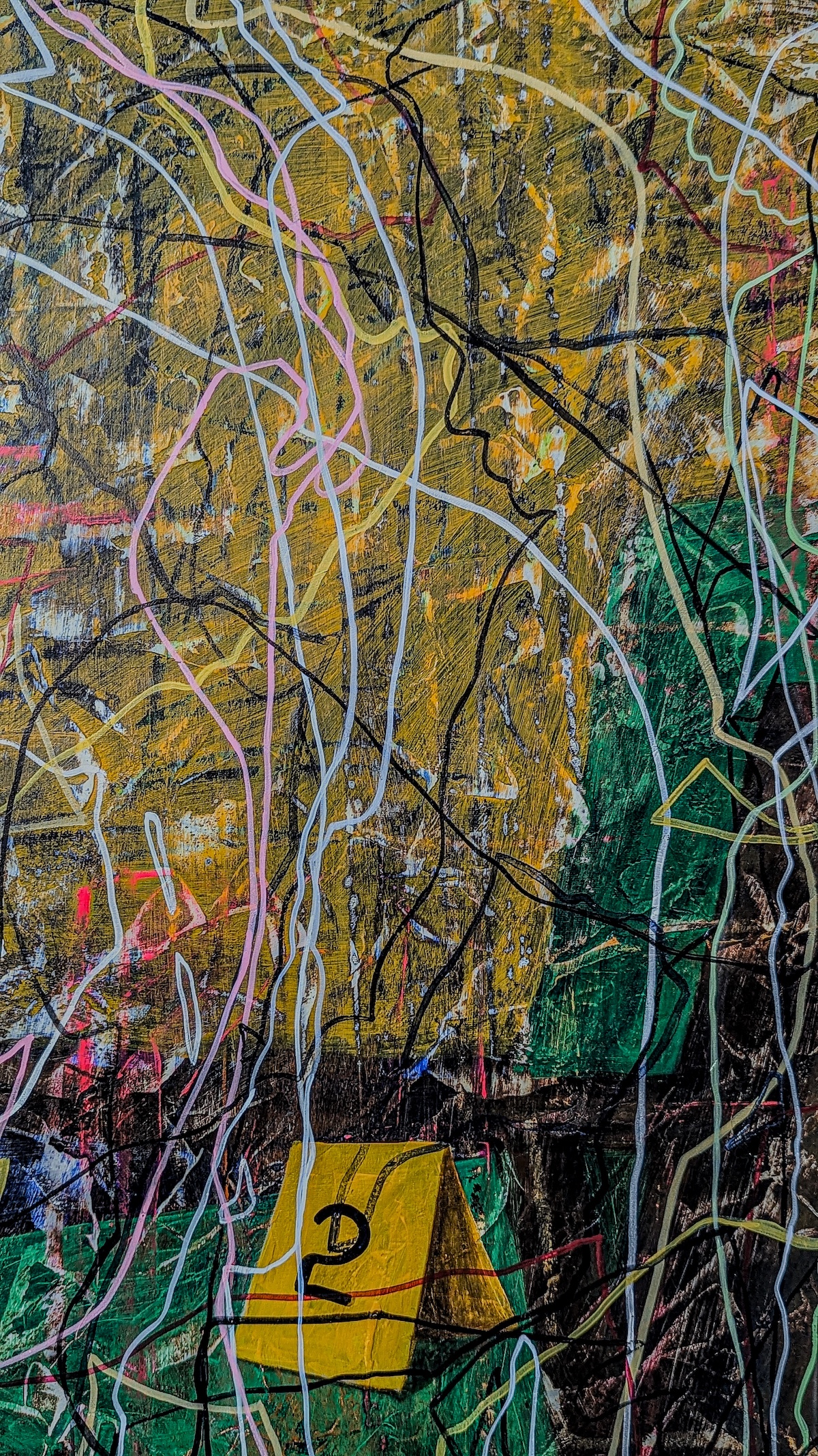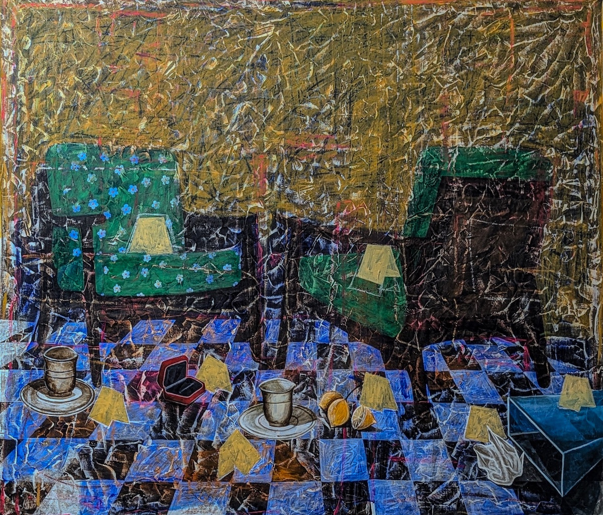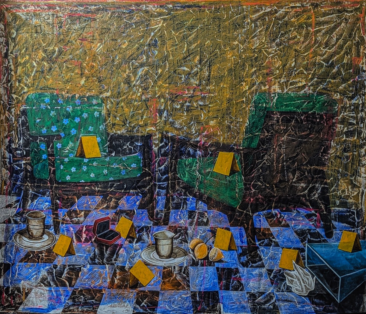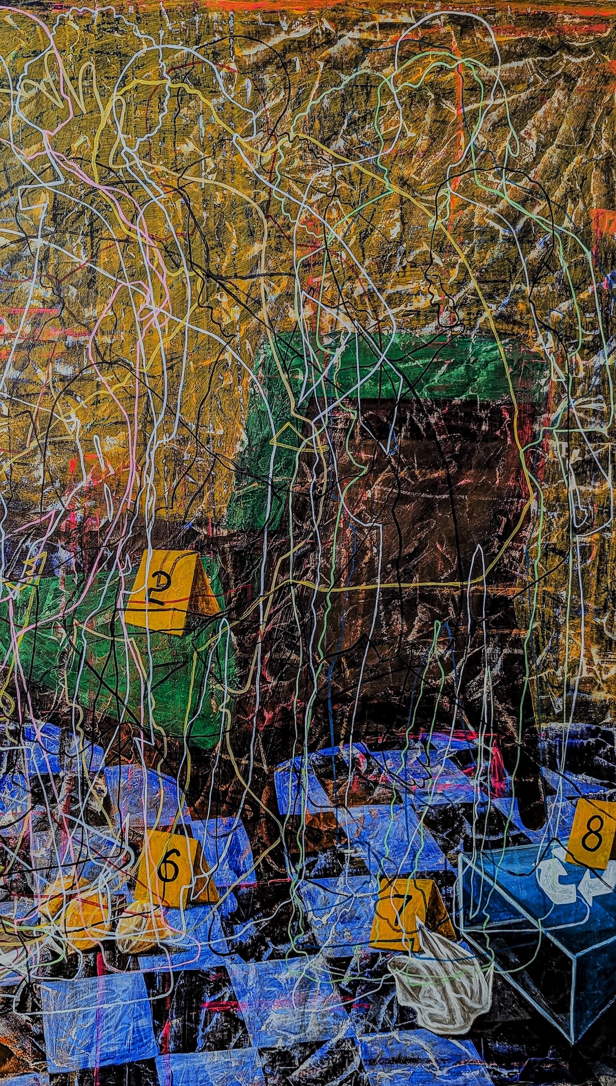 Chairs, cups, a red ring box, a trashed piece of paper, and a recycling bin overlaid with a vibrant, almost chaotic network of abstract lines: the hint of a human figure in a dense, energetic field.