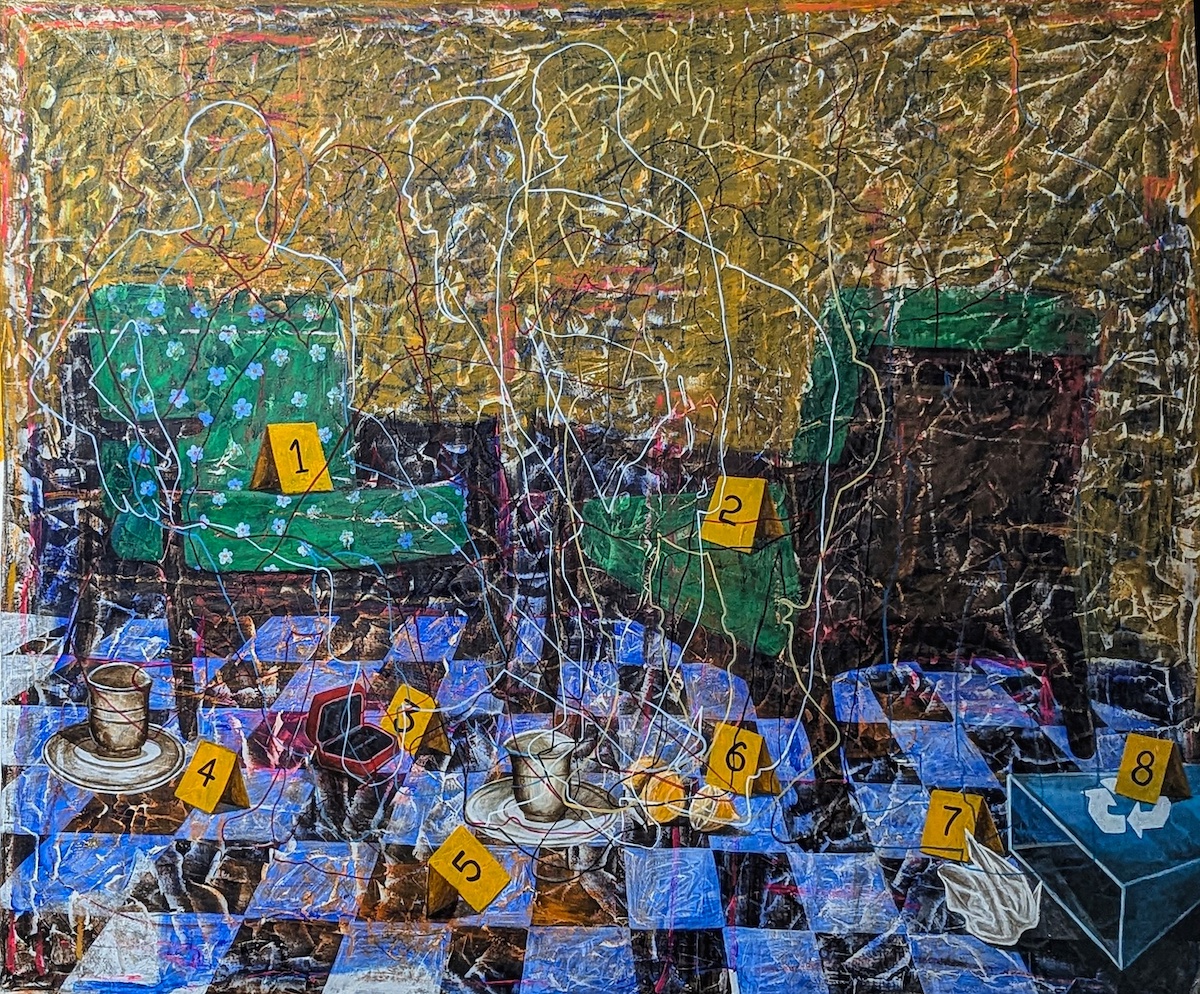 The scene: reminiscent of a crime investigation, employing universally recognisable yellow forensic markers to delineate various objects within a domestic setting.